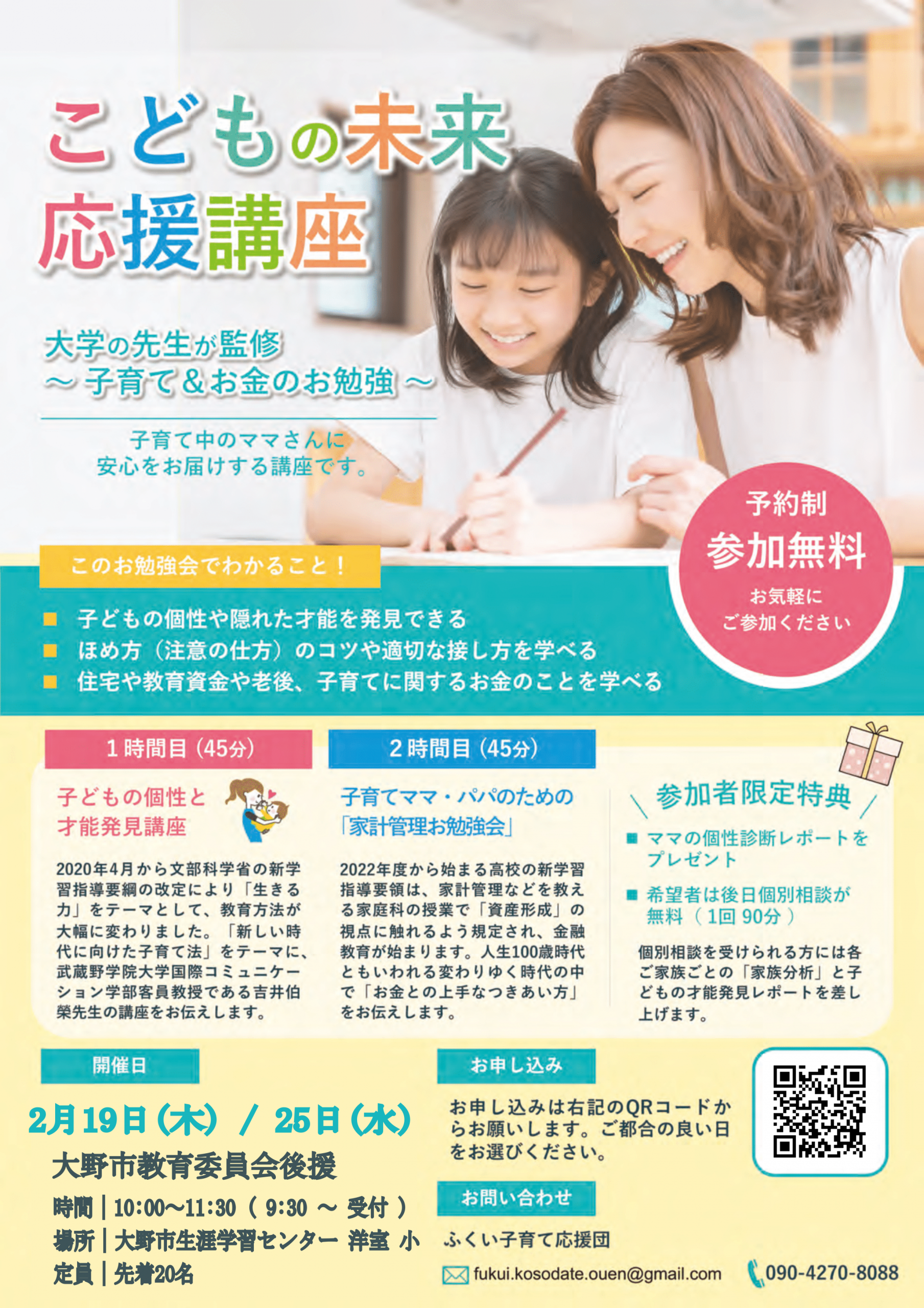 [令和8年 2月 大野開催]こどもの未来応援講座 (大野市教育委員会後援) 投稿日 2025年12月5日 著者 ふくい子育て応援団事務局 カテゴリー 受講受付中 ■会場開催 2月19日(木)・2月25日(水)時間|10:00~11:30 ( 9:45 ~ 受付 )場所|大野氏生涯学習センター 洋室小定員|先着20名 後援|大野市教育委員会後援 詳細チラシはこちらから お申込みはこちらから